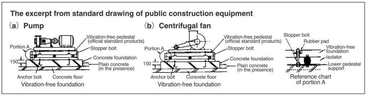 Floor type vibration proof rubber for pump, A/C, fan, electric motor, compressor, vertical/horizontal plumbing. The most basic type of vibration proof rubber. Usually, this rubber is found between upper and lower steel frame.