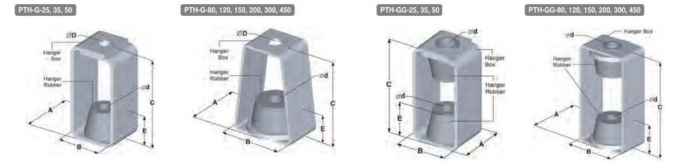TOZEN PTH-G vibration isolating rubber hangers are designed to reduce the transmission of vibration and noise produced by suspended equipment, piping and ductwork. PTH-G hangers incorporated with a noise absorbing rubber insert with cast-in load transfer plate at the top and bottom, assembled into a steel box. Ultimate design of PTH-G hanger rubbers allows greater deflection without accelerating deterioration. PTH-G hangers are available in deflection maximum up to 6 mm with capacities from 25 Kgs to 450 Kgs. PTH-G rubber hangers may be selected where first cost must be minimized. MODEL PTH-G is recommended for the isolation of vibration produced by suspended mechanical equipment, axial and exhausts fans, ductwork, piping, etc. Double deflection model PTH-GG adds another rubber element at the top of the hanger box.