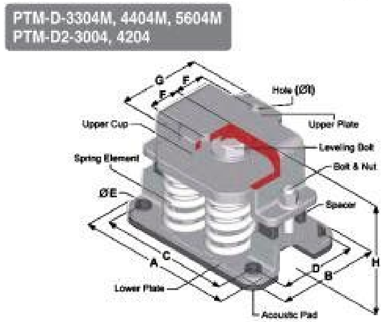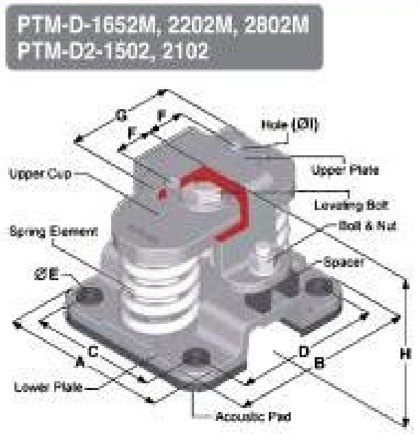 PTM-D series vibration isolator are shipped with standard deflections of 25 and 50 mm, and available up to 50mm, with load capacities from 450 Kgs to 5,600 Kgs. Model PTM-D spring isolators are recommended for the isolation of vibration produced by equipment carrying a large fluid load which may be drained, such as boilers and chillers, and for the isolation of cooling towers, air cooled condensers, etc., where motion due to wind loads must be minimized.
