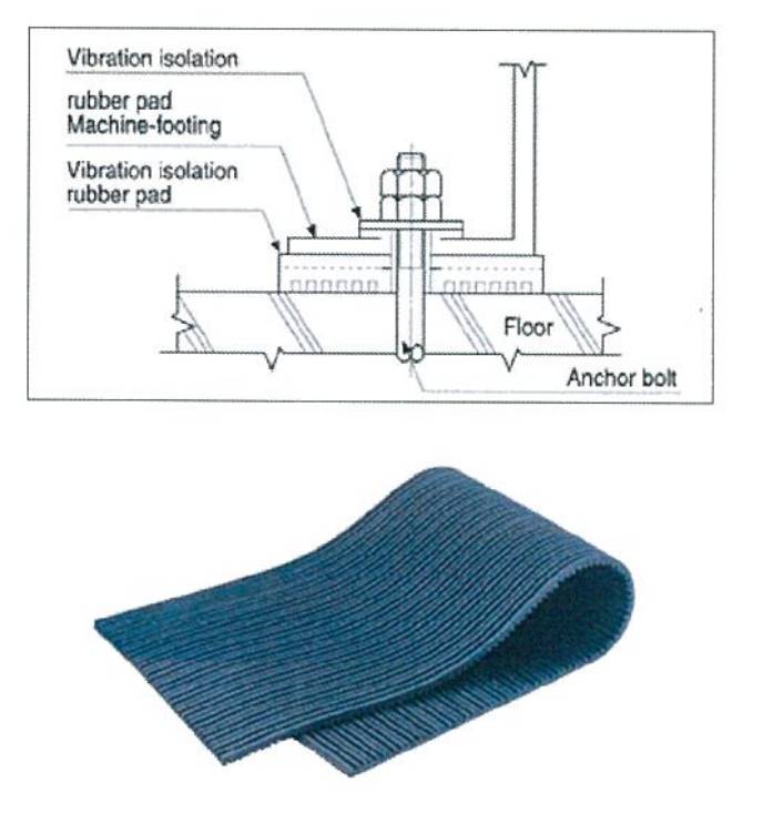 DESCRIPTION: TOZEN PT-MAT can be cut out to any suitable square or rectangular sizes easily to suit various mounting footings of machines or equipment for effective isolation of shock and vibration. In most cases no anchor bolting is required. Ingeniously designed having ribs of upper and lower surface arranged at right angles and optimum rubber hardness (55-60 durameter) PT-MAT performs effectively against shock and vibration both laterally and vertically. At the same time noise caused by vibration is thus also reduced. In view of design and material aspects PT-MAT can withstand and absorb greater impact from various machines and equipment. It provides larger buffer capacity per unit area. Compared with other vibration isolation devices PT-MAT is the most economical type available due to mass production. Each sheet can be fully utilized without waste. The 3 different thickness(t) of PT-MAT are recommended for 2-4 kgf/cm².